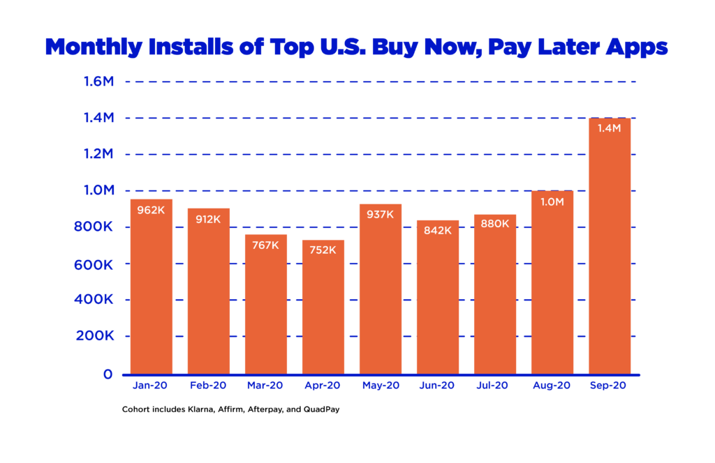 Taking a look at the popularity of BNPL during 2020, the peak of the COVID-19 pandemic in the U.S. corresponds to a rise in BNPL app downloads, with a noticeable 1.4M spike in September 2020 downloads, as per a survey conducted by SensorTower.