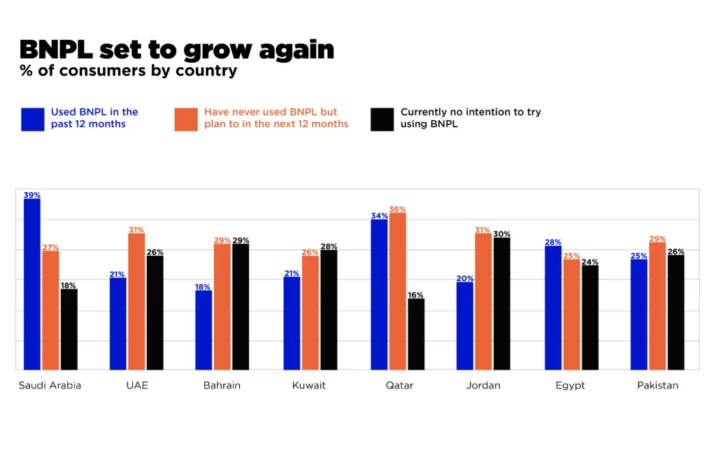 Qatar comes in second at 34%, followed by Egypt at 28%, a remarkable achievement for Egypt in particular, whose population is roughly triple that of Saudi Arabia and Qatar put together, and a great indicator that BNPL is here to stay.