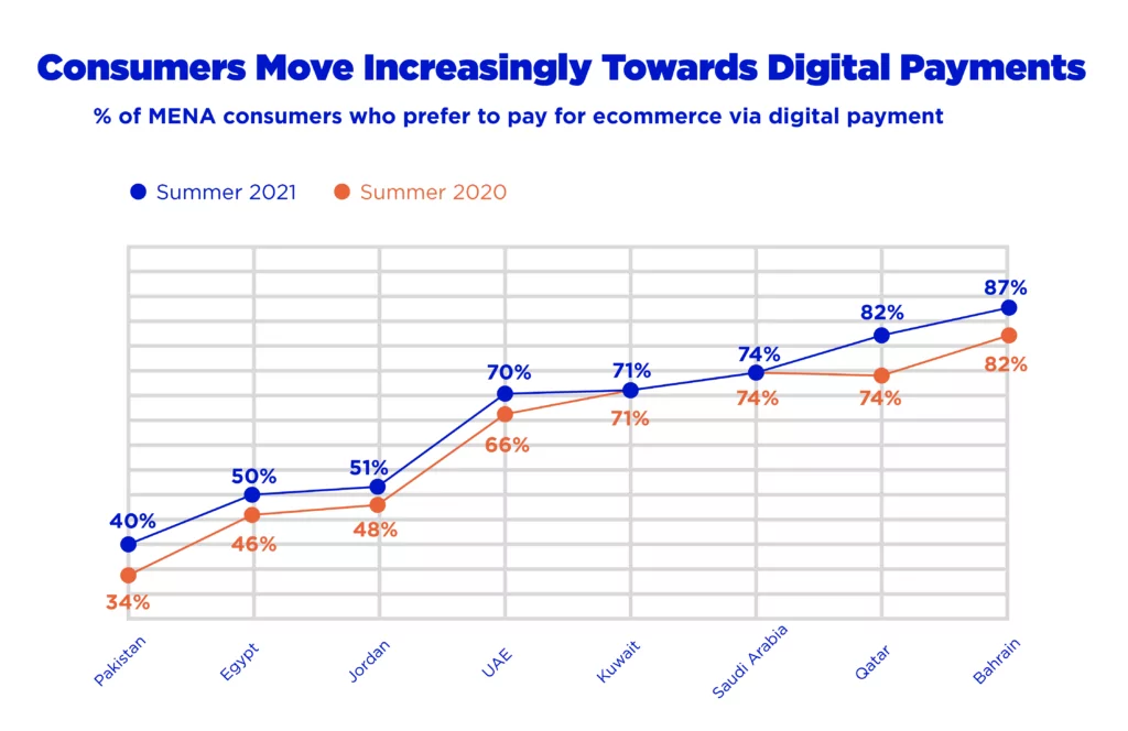 Compared to 2020, 2021 marked a shift in preferences when it comes to using digital payment methods in the MENA region, with Bahrain coming in the first place as 87% of its population preferred digital payment, an 5% increase from the previous year. Qatar follows suit at 82% (an 8% increase) and Saudi Arabia at 74%.